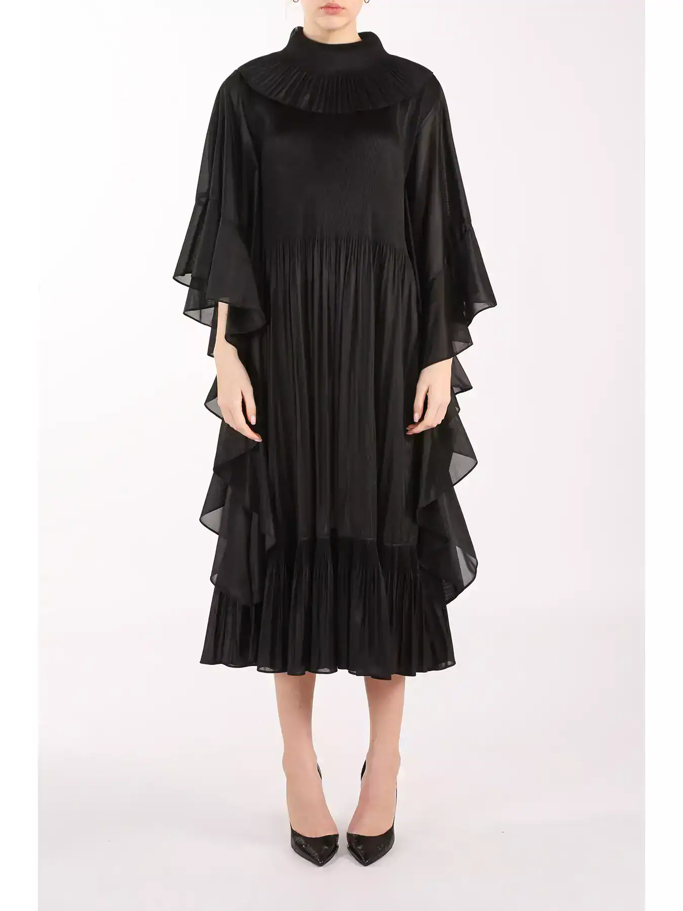Beulah Style Ruffled Detail Black Pleated Maxi (One Size – O/S)